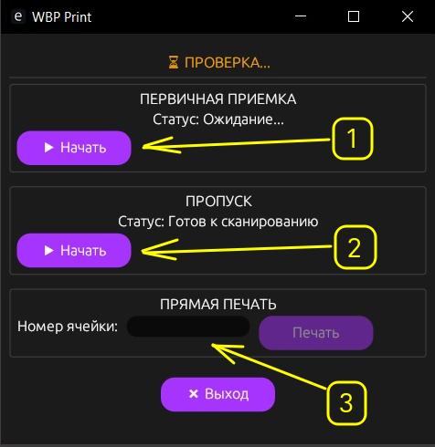 - Стрелка. На случай если вы вы вдруг опоздали на приемку и у вас осталось мало времени. Вы не успеваете приклеивать стикеры на товар. Тогда вы без WBP Print быстро проходите приемку просканировав все товары откладываете их в сторону. После чего вы укладываетесь в необходимое вам время. Дальше открываете WBP Print нажимаете Начать - где стрелка 2 и начинаете заново сканировать товары и уже спокойно приклеивать стикеры без ограничений по времени. Внимание - окно WBP Print должно быть активно.
